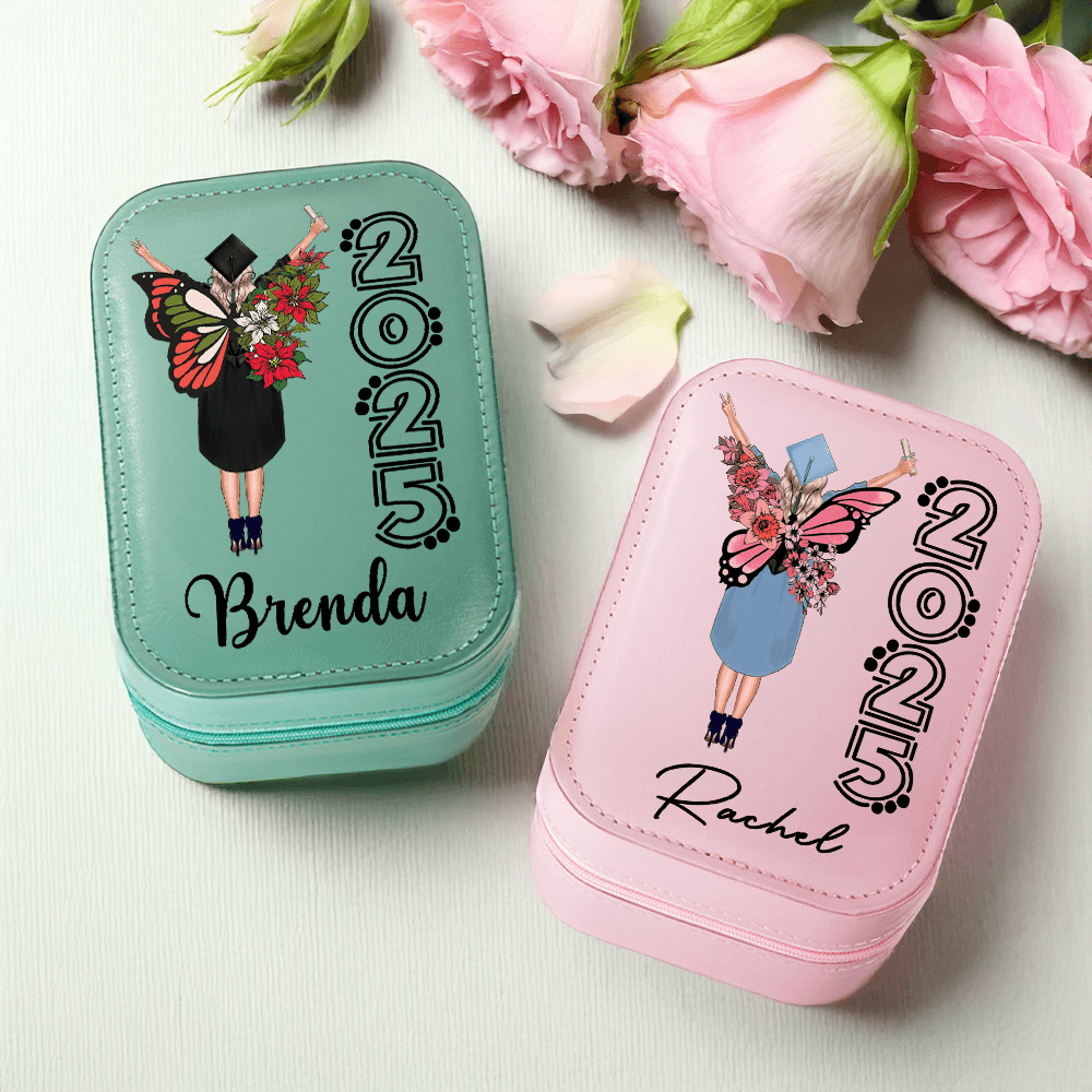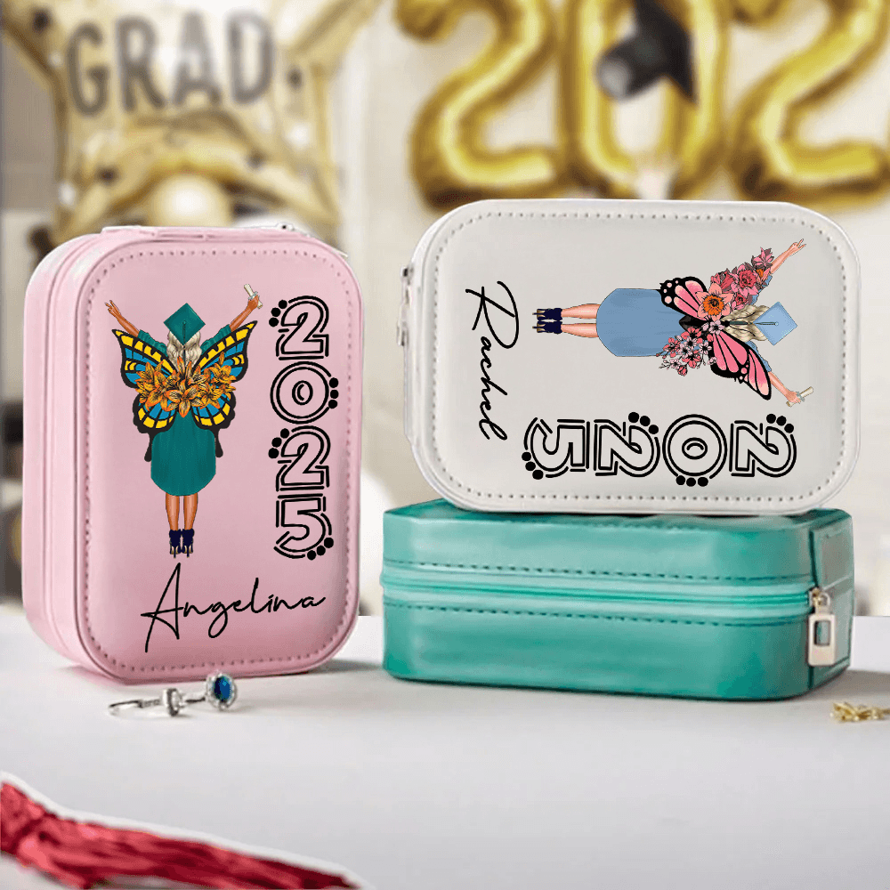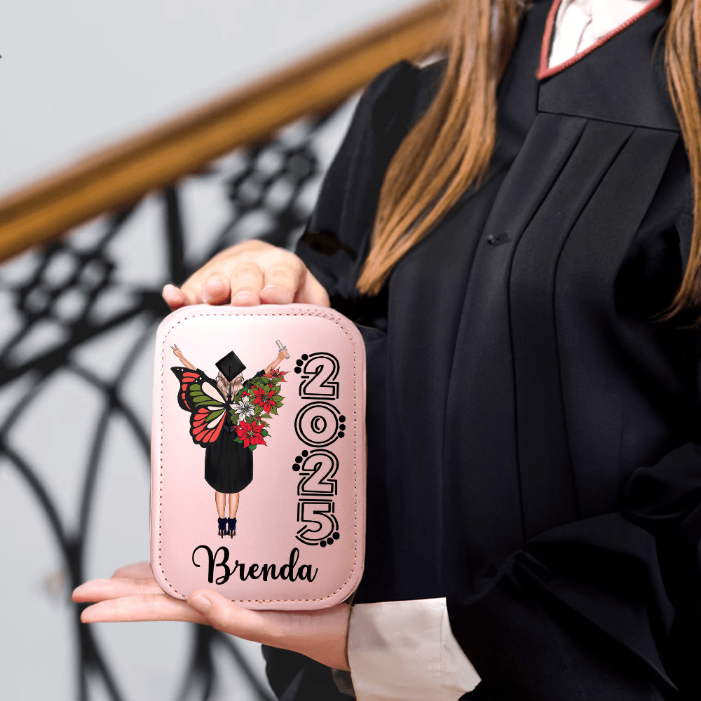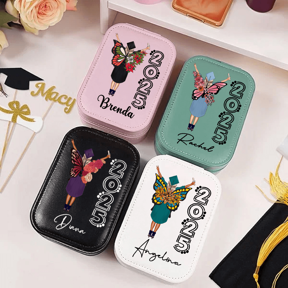 Personalized Design - This elegant jewelry box features a customizable cartoon character representing the graduate, their name, graduation year, and a beautiful birth flower butterfly design. This unique personalization makes it a special keepsake.