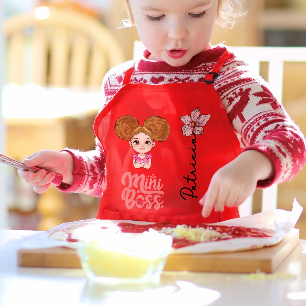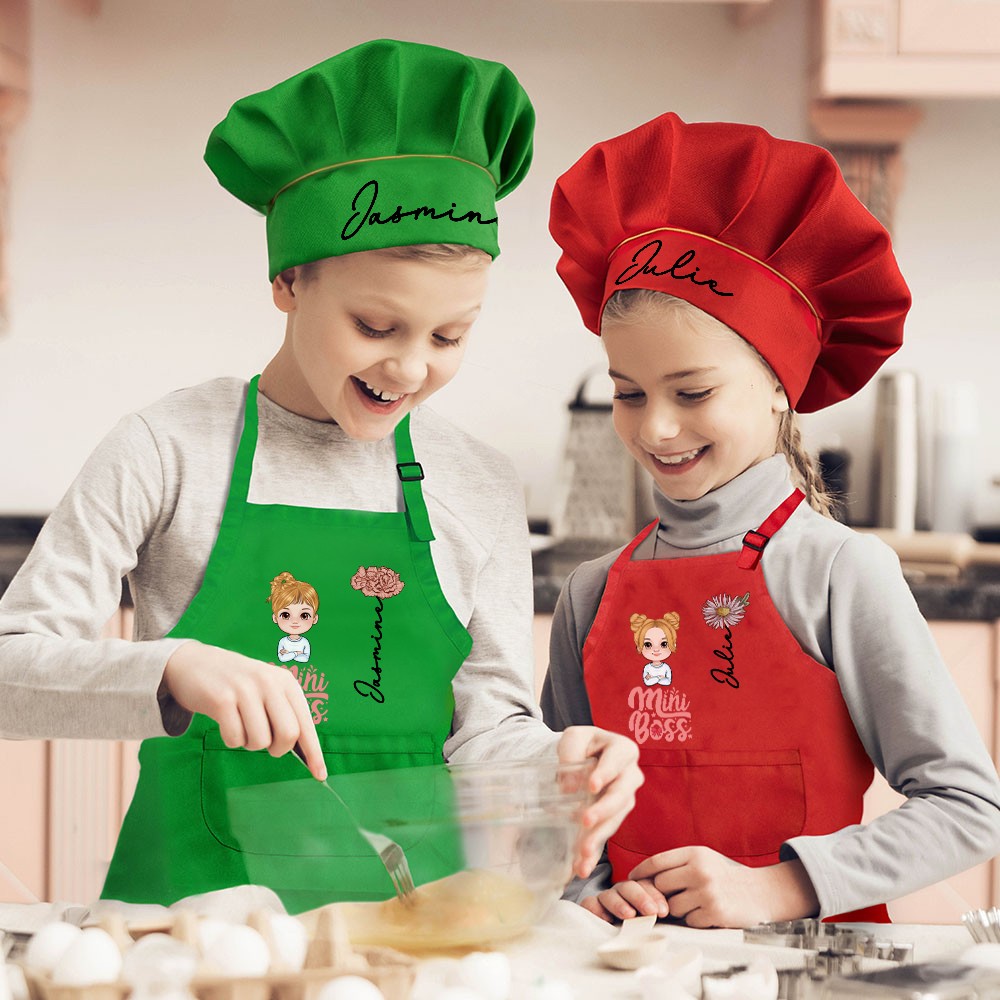 Personalized Mini Boss Cartoon Kid Pocket Apron & Chef Hat, Custom Name & Birth Flower Apron Set, Kitchen Accessory, Birthday Gift for Kids