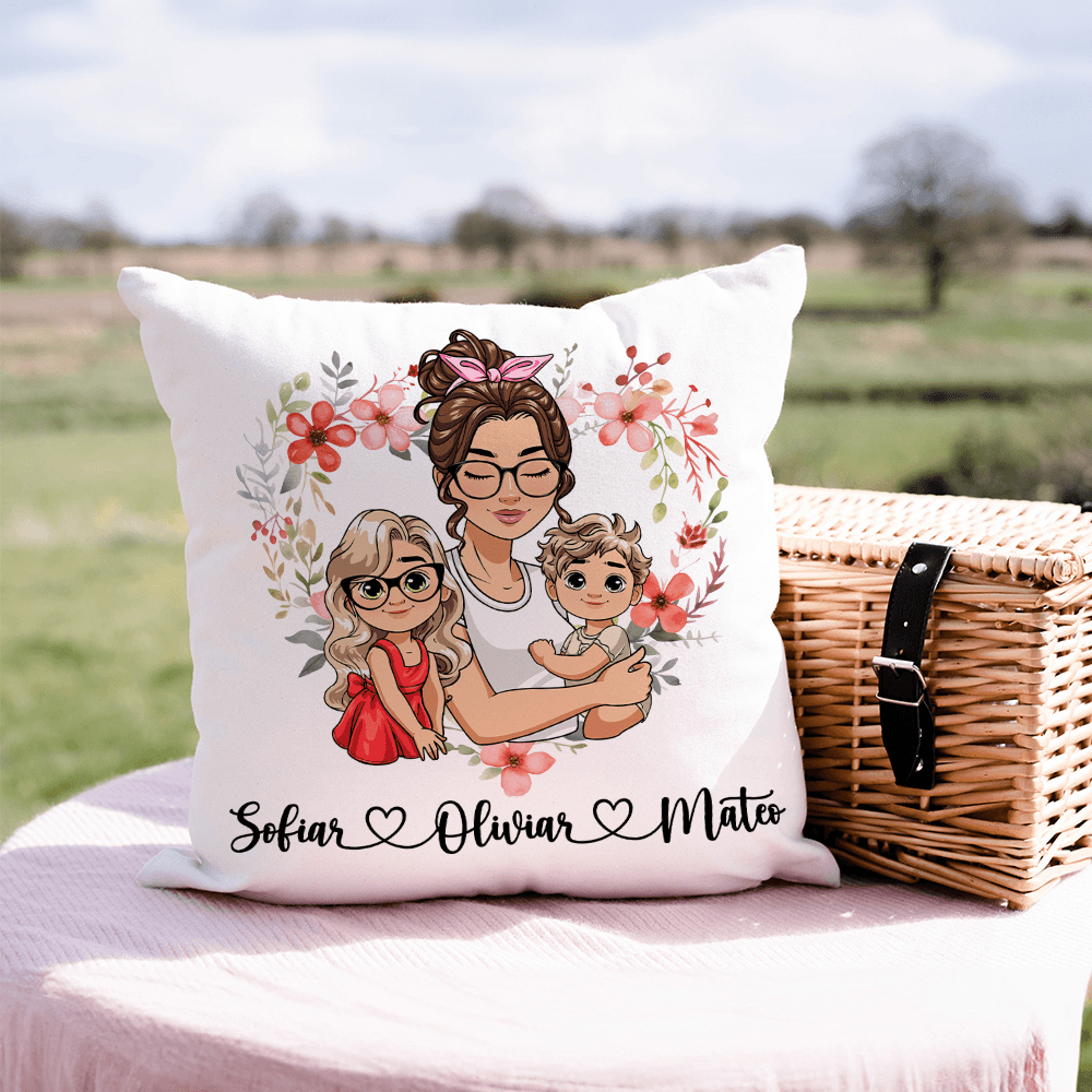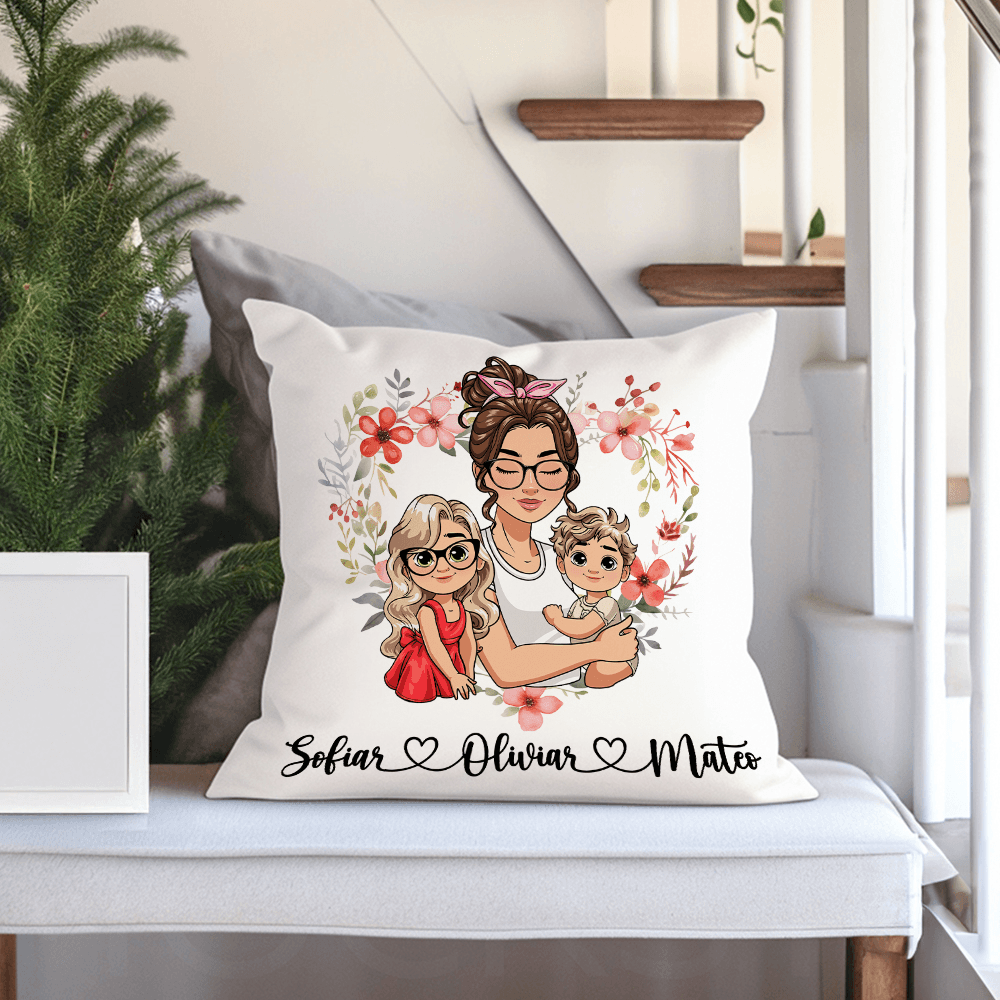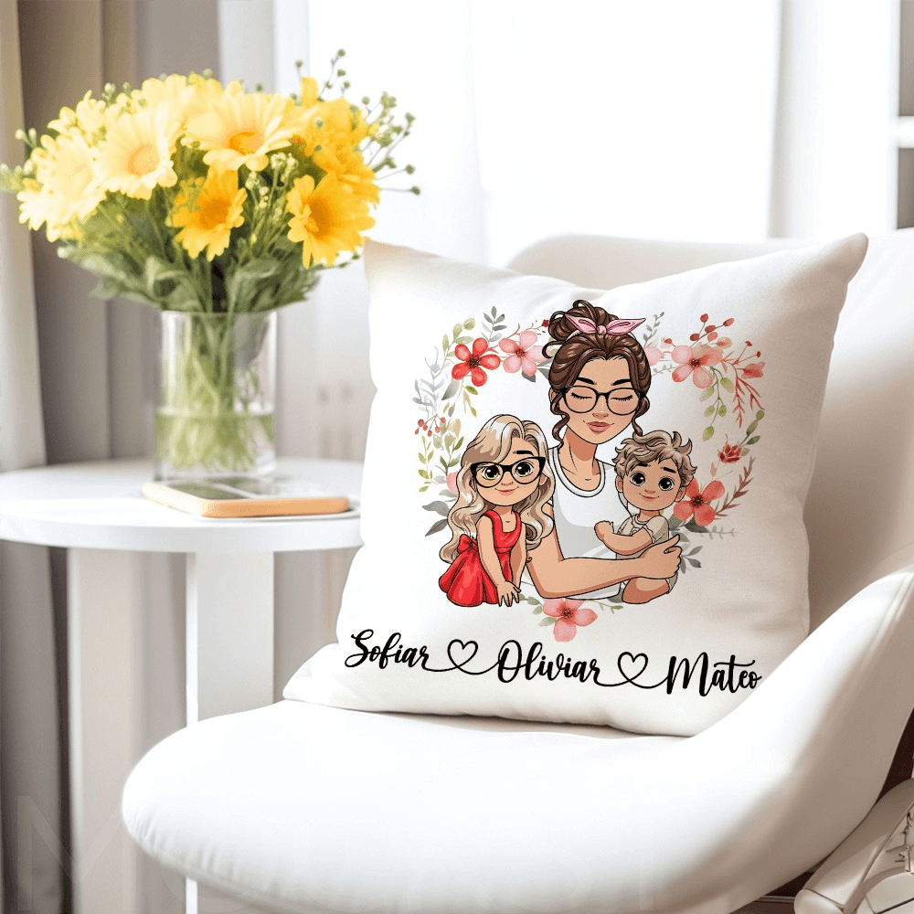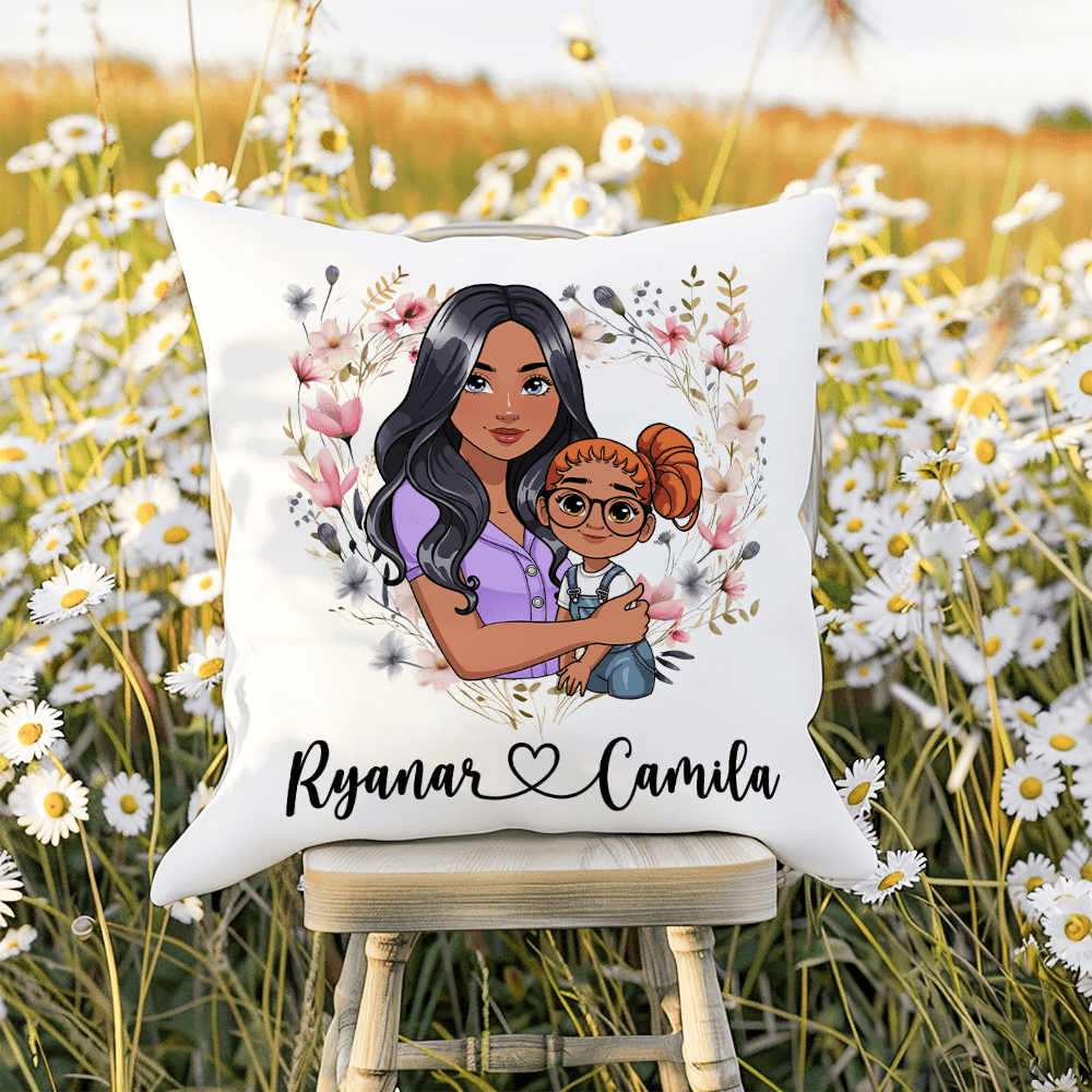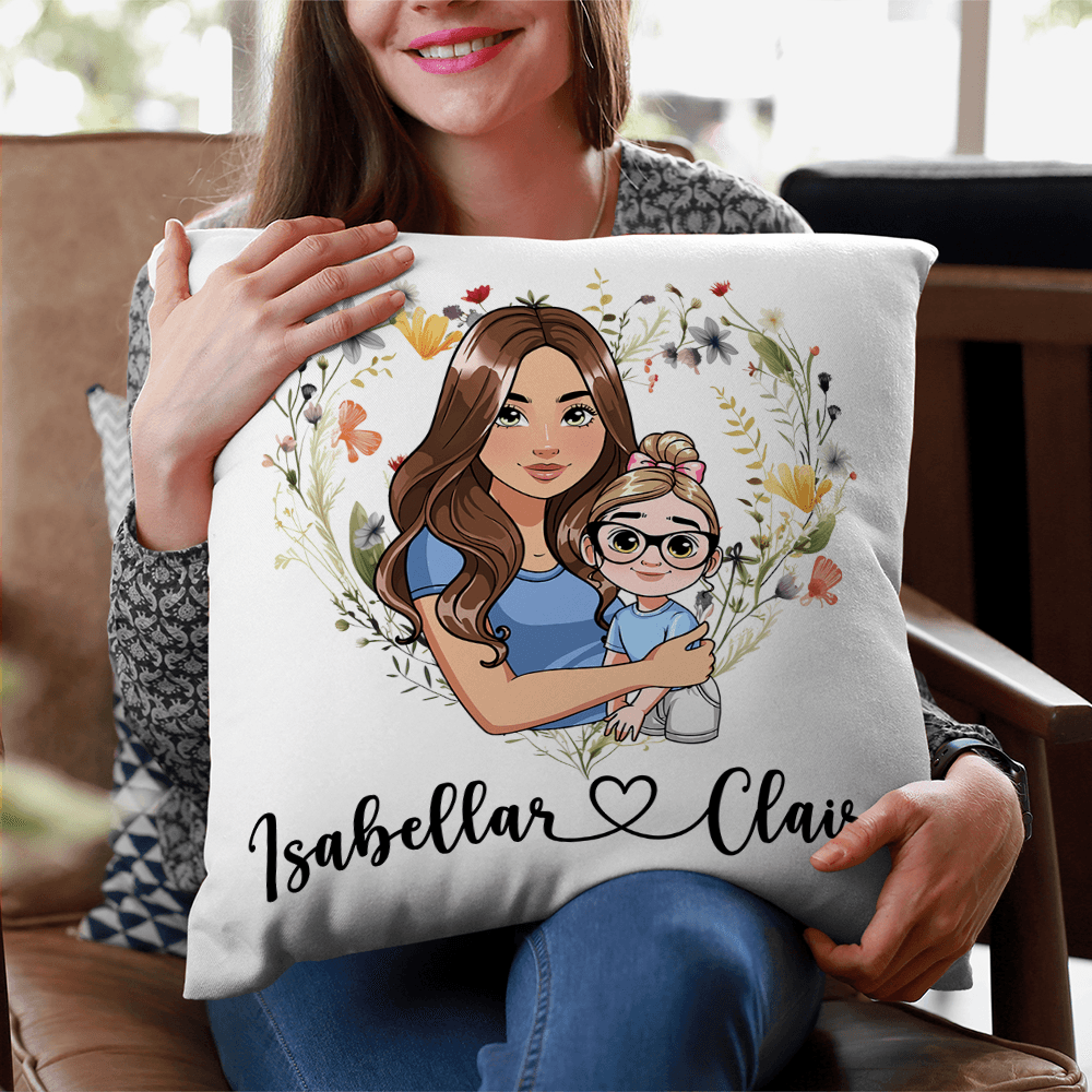 | Style | Personalized Mom and Kid Cartoon Character Pillow Cover with Heart Wreath |