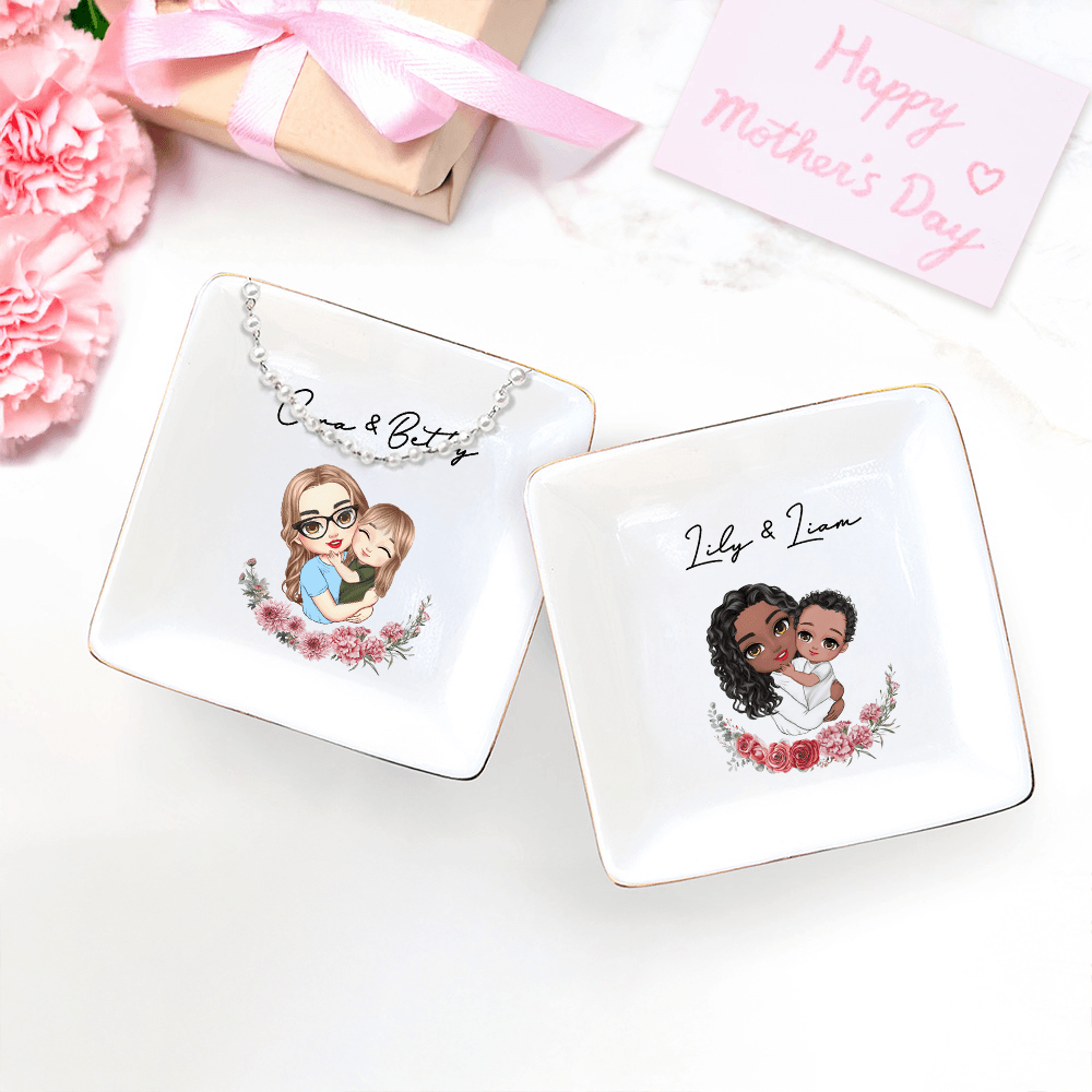 Personalized Touch - The dish features an adorable cartoon character design of a mother and child, adding a whimsical touch. It is personalized with a name and a birth flower, creating a unique and meaningful piece that celebrates the bond between mother and child.
