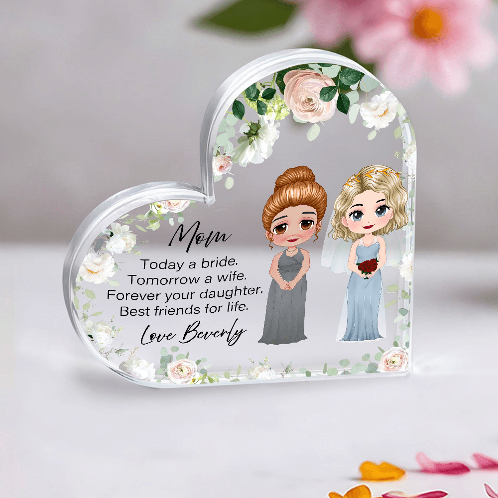 Customizable Design - This charming acrylic plaque features adorable cartoon characters representing the bride and her mother, complete with personalized names. It also includes a touching message that celebrates the bond between mother and daughter, making it a perfect reminder of their love and support throughout life's milestones.