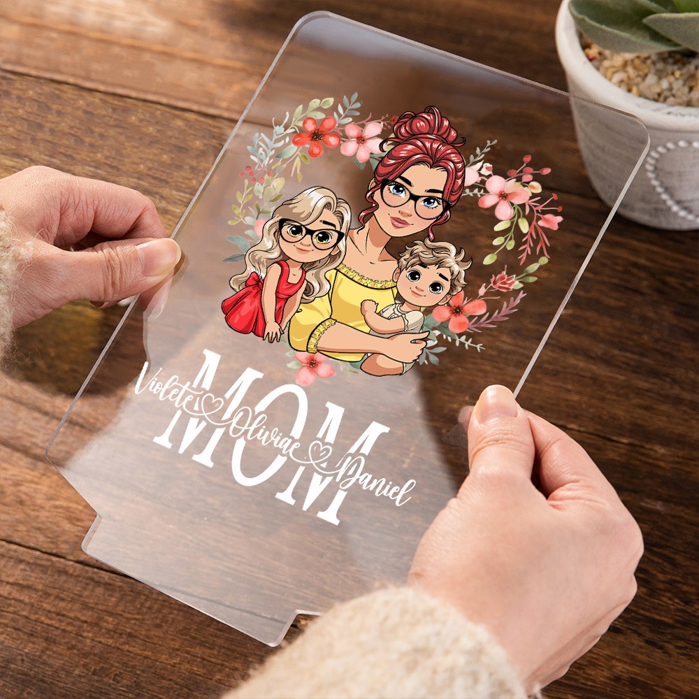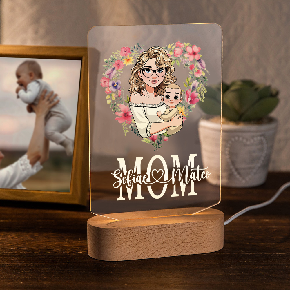 Personalized Touch - This night light features a personalized cartoon design of mom and child, with their names and a sweet flower heart, creating a touching and unique decorative piece that celebrates love and family.