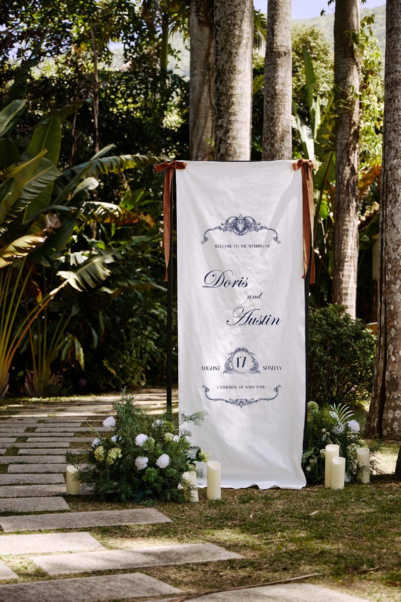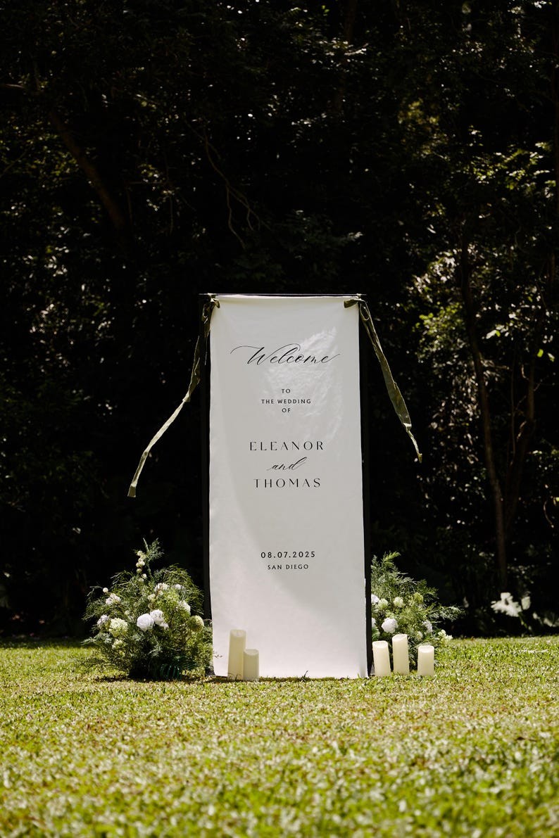Welcome your guests with a fabric sign that speaks from the heart — now thoughtfully adorned with soft linen-cotton ribbons, ready to be tied into graceful bows. Every detail whispers warmth, elegance, and the promise of a beautiful day.