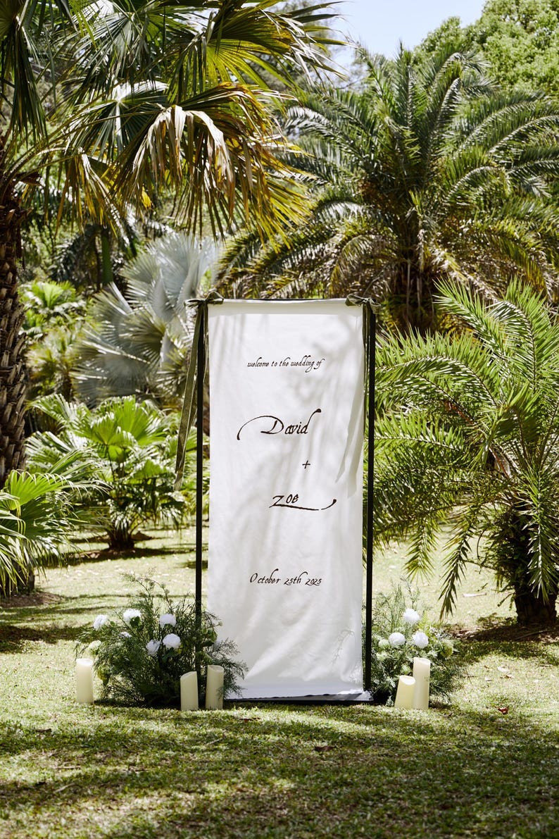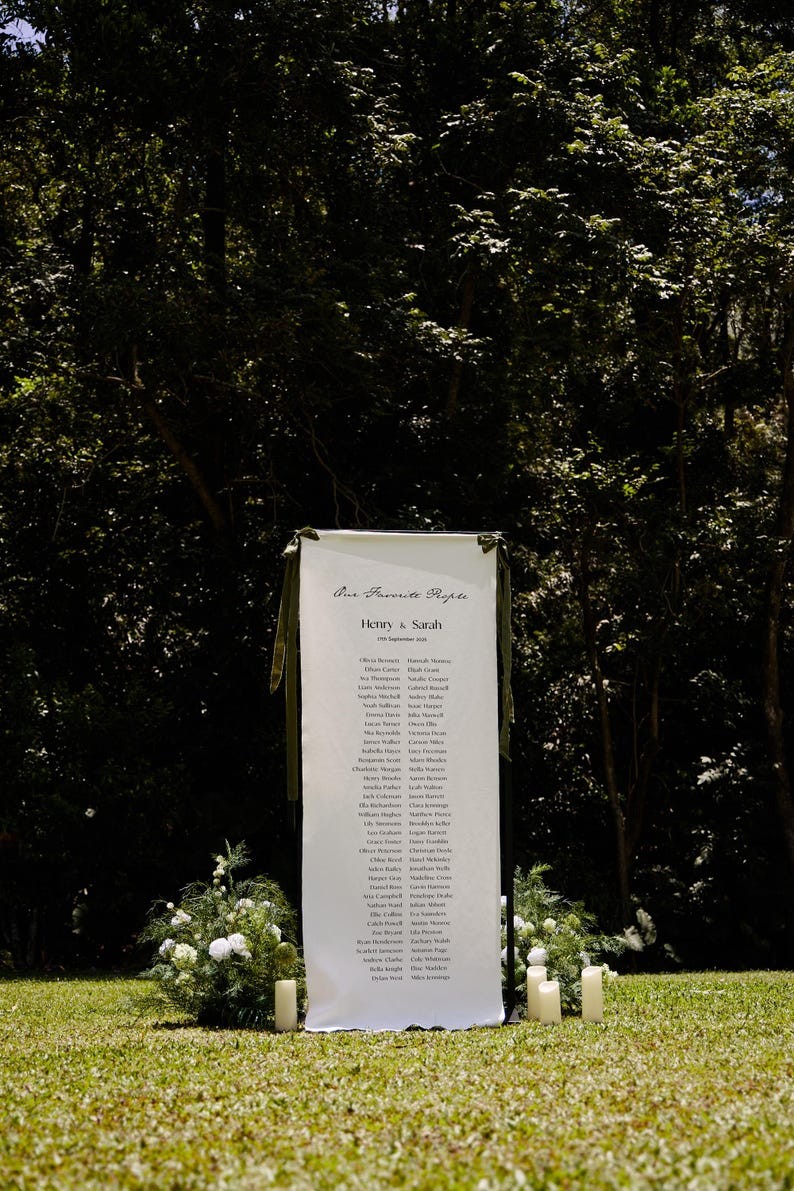 Your names, your date, your moment — all captured on fabric as a lasting keepsake. Choose from our curated sizes (35×100cm, 75×75cm, or 75×200cm), or contact us for a custom fit up to 150cm wide. Every sign is crafted to honour your story, your way.